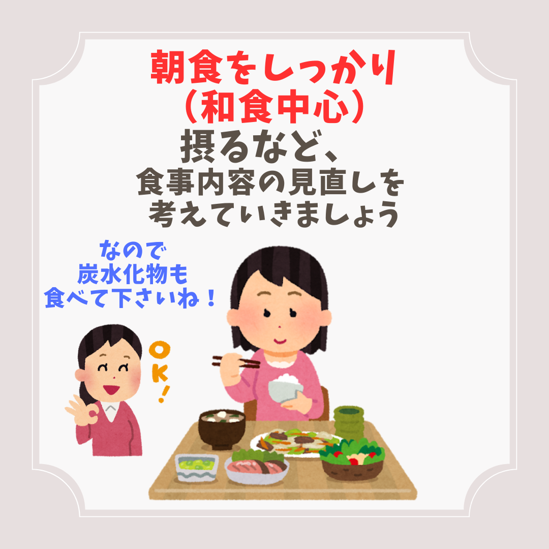 まず朝食をしっかり(和食中心)摂るなど、 食事内容の見直しを 考えていきましょう