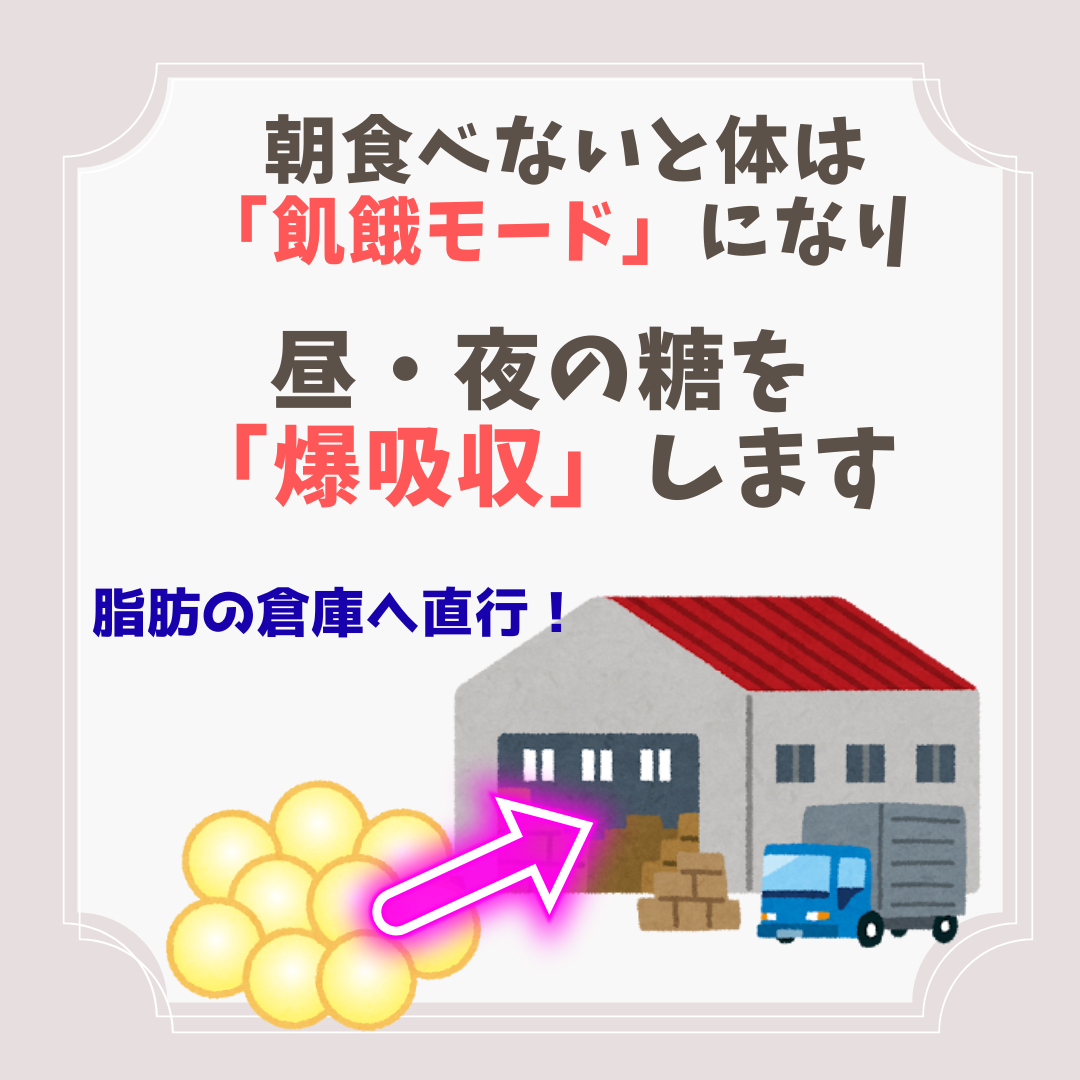 朝から食事を抜いたりしていると、体がエネルギー不足を感じ、次に食べた昼食や夕食の糖を「爆吸収」してしまい、脂肪として蓄えやすくなってしまうんです。