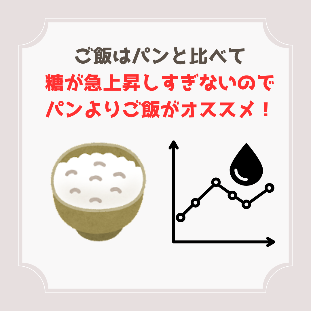 ✅ ご飯(お米):パンに比べて血糖値の上昇が緩やか。腹持ちも抜群です。