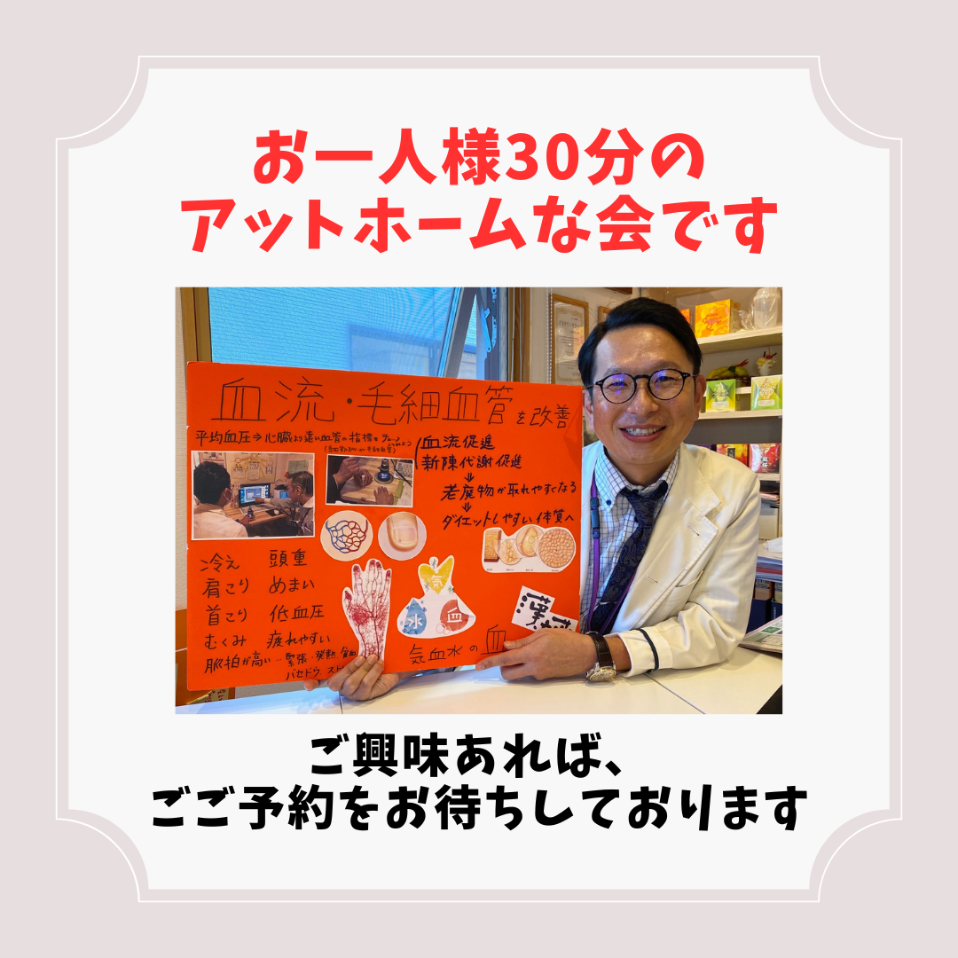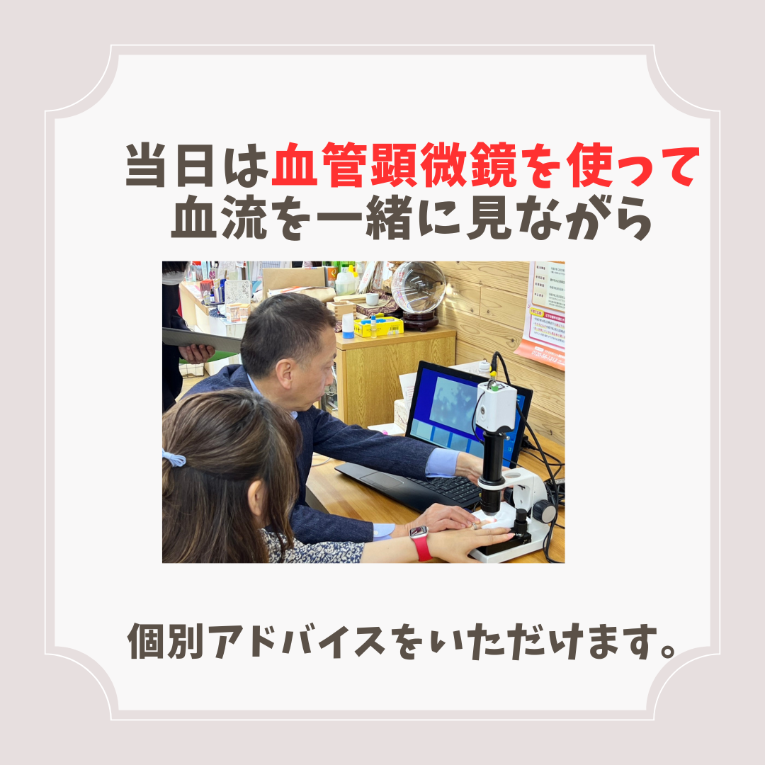 当日は血管券病を使って血流を一緒に見ながら、個別アドバイスをさせて頂きます